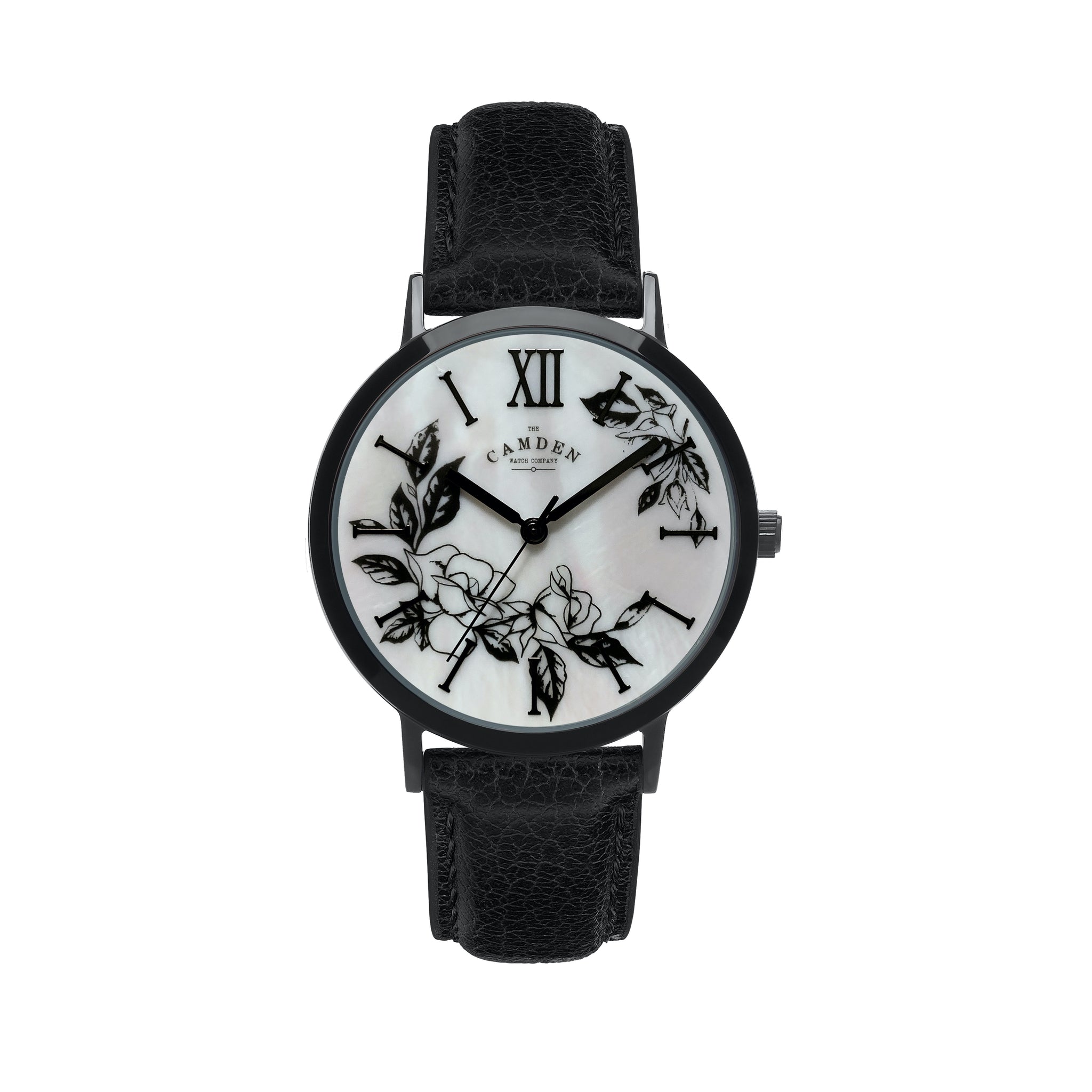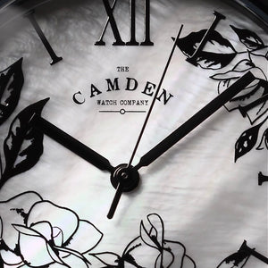 A No.27 Camden Watch designed in collaboration with tattoo artist Rebecca Vincent. Inspired by the Victorian Language of Flowers, Rebecca has brought her signature style to the white Mother of Pearl dial, making this monochrome watch a beautiful and striking addition to any wrist.