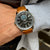 STEEL CASE WITH GREEN DIAL, WHITE ACCENTS AND BROWN LEATHER STRAP