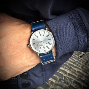 STEEL CASE WITH SILVER DIAL AND NAVY LEATHER STRAP.