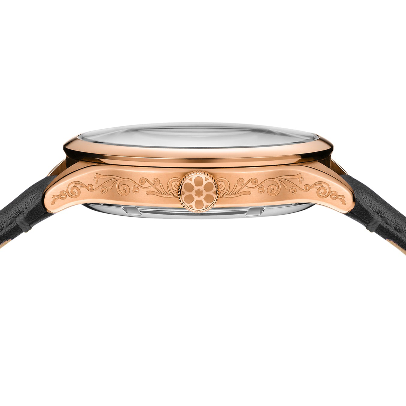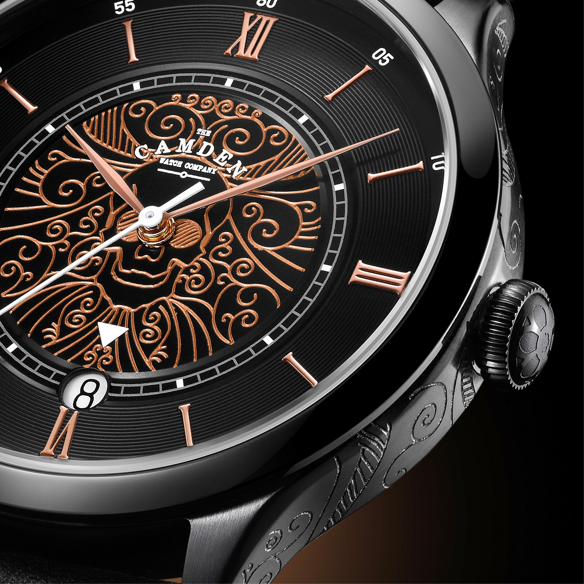 Contrary to the morose name, it serves as an inspiration to live each day as it comes and not get caught up in the stress of daily life. Because to remember you must die is to remember you must live. This edition features a black dial with subtle rose gold detailing and a black leather strap.
