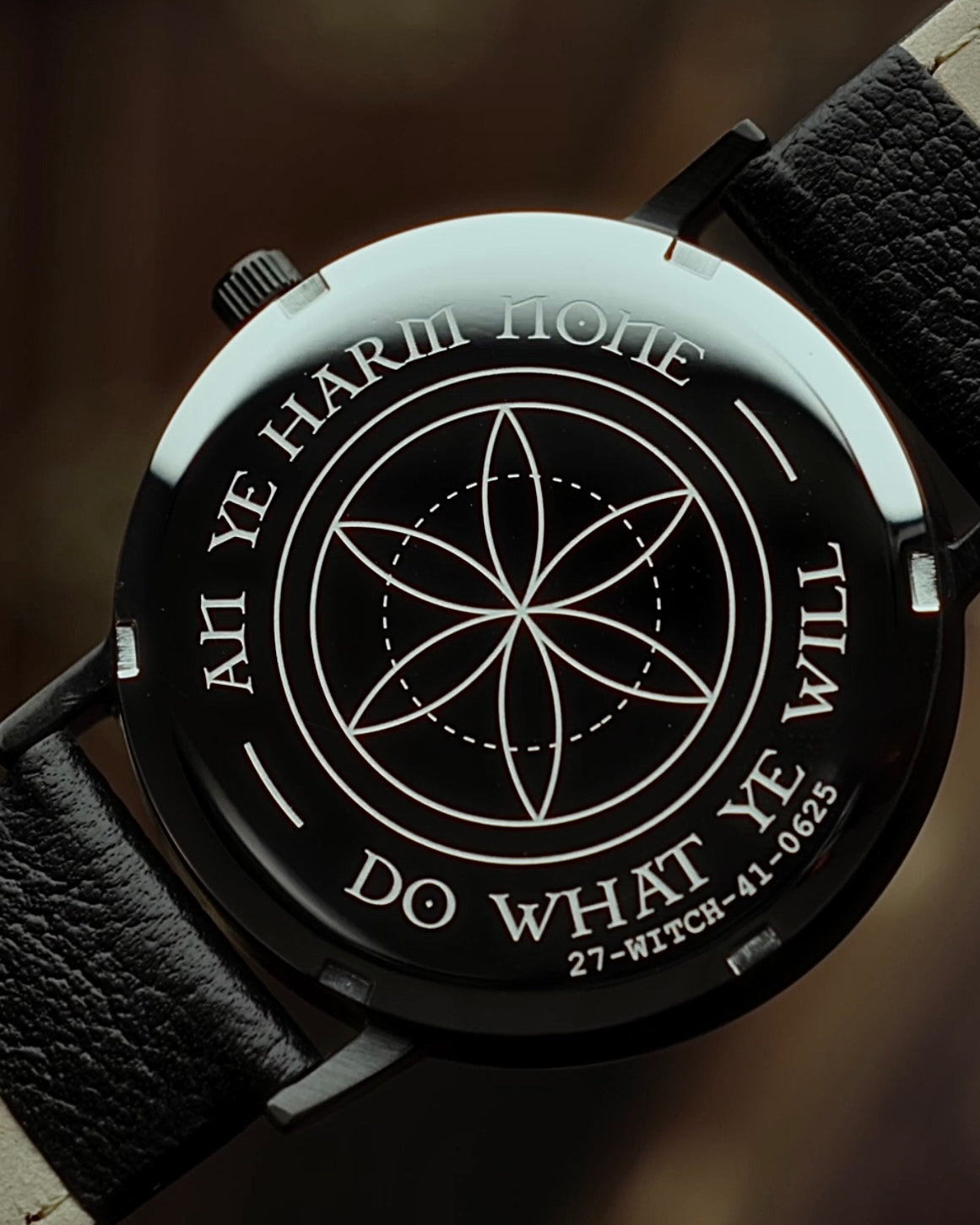 On the case back, another daisy wheel appears beside the words: “An ye harm none, do what ye will.” A reminder to live freely, without causing harm - and to always carry a little magic on your wrist.