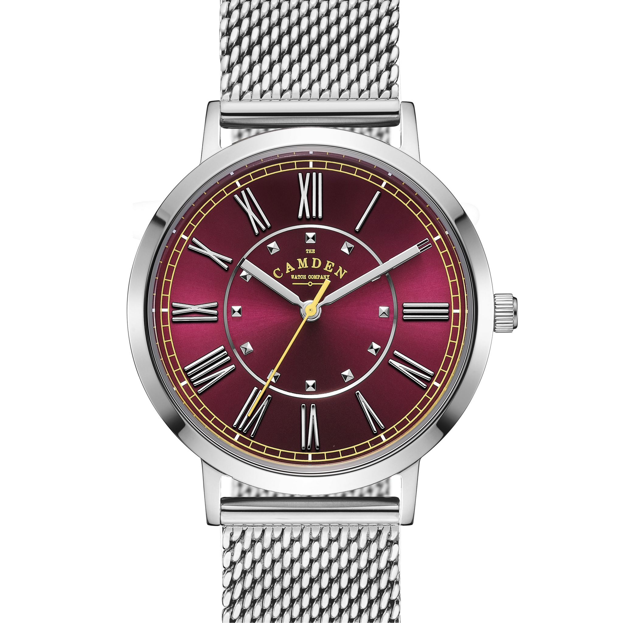 STEEL CASE WITH OXBLOOD DIAL AND STEEL MESH BAND.