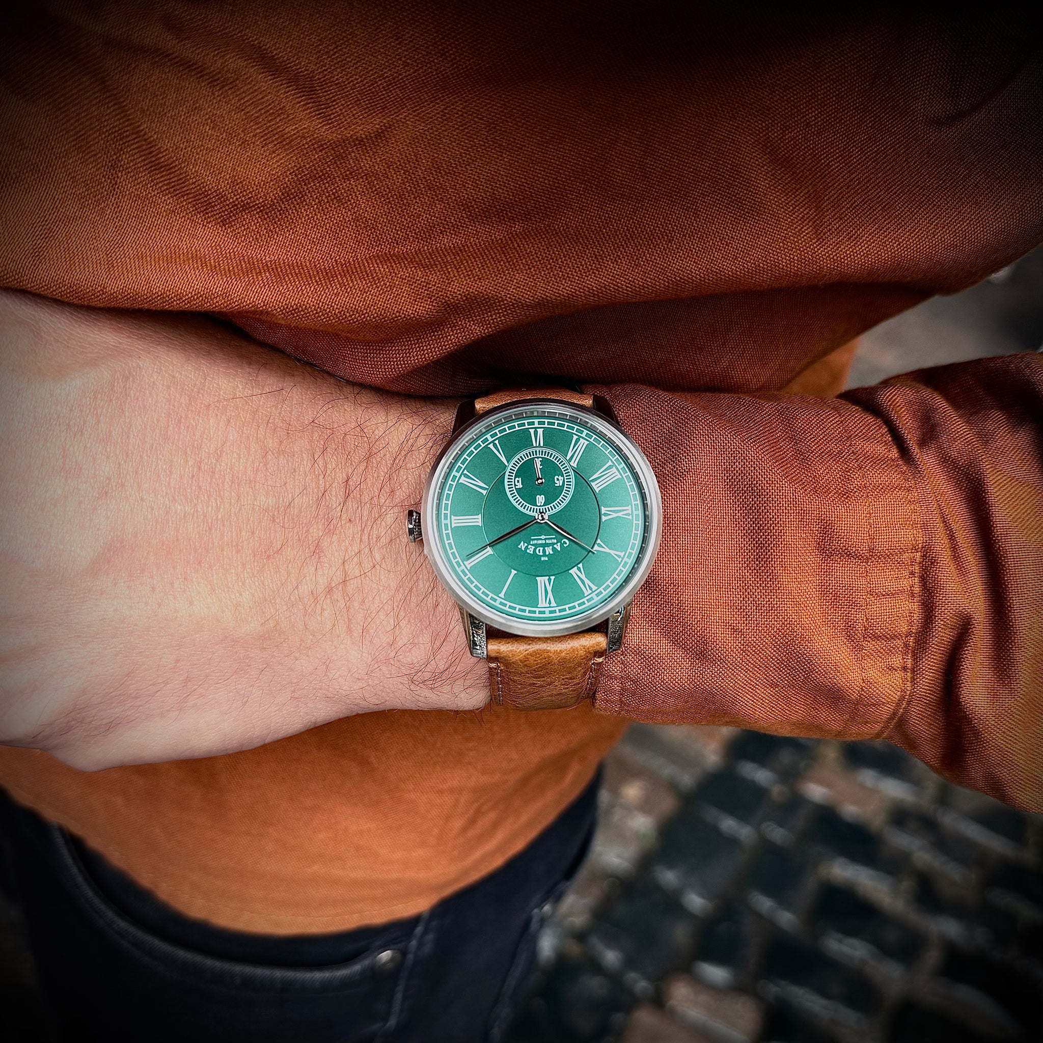 STEEL CASE WITH GREEN DIAL, WHITE ACCENTS AND TAN LEATHER STRAP