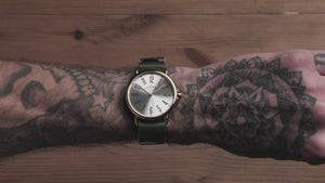 GOLD CASE WITH SILVER DIAL AND GREEN NATO STRAP.