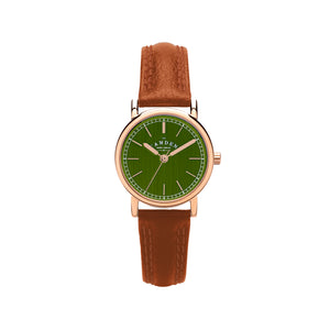 ROSE GOLD CASE WITH GREEN DIAL AND TAN LEATHER STRAP.