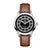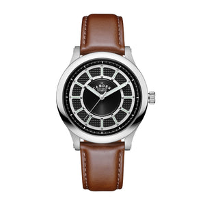 • STEEL CASE WITH SILVER DIAL AND TAN LEATHER STRAP.