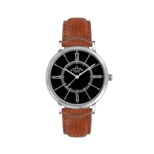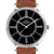 • STEEL CASE WITH BLACK DIAL AND TAN LEATHER STRAP.