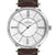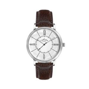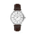• STEEL CASE WITH WHITE DIAL AND BROWN LEATHER STRAP.
