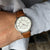 STEEL CASE WITH WHITE DIAL AND TAN LEATHER STRAP.