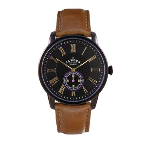 BLACK CASE WITH BLACK DIAL, PURPLE ACCENTS AND TAN LEATHER STRAP.