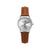 • STEEL CASE WITH SILVER DIAL AND TAN LEATHER STRAP.