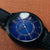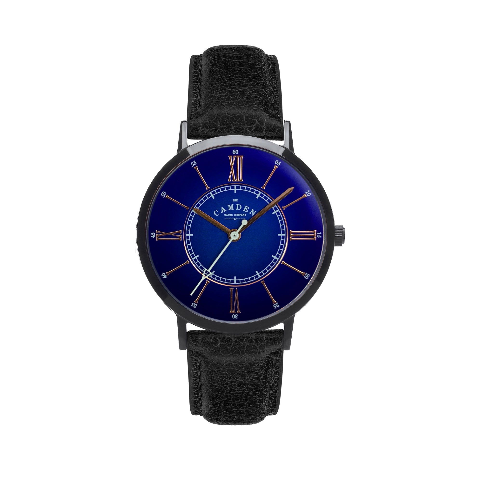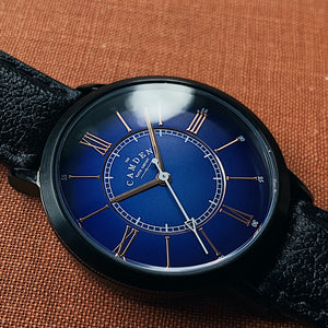 • BLACK CASE WITH BLUE GRADIENT DIAL, ROSE GOLD ACCENTS AND BLACK LEATHER STRAP.