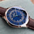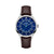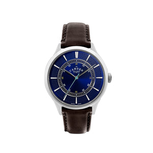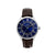 STEEL CASE WITH NAVY DIAL AND BROWN LEATHER STRAP.