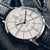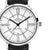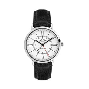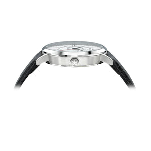 • STEEL CASE WITH WHITE DIAL AND BLACK LEATHER STRAP.