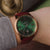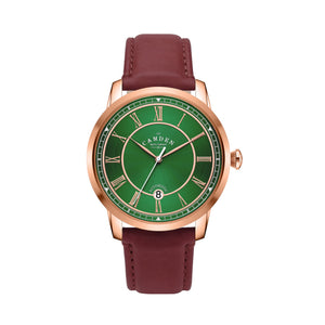 • ROSE GOLD CASE WITH GREEN DIAL AND OXBLOOD ITALIAN LEATHER STRAP.