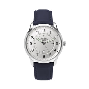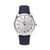STEEL CASE WITH WHITE DIAL AND NAVY LEATHER STRAP.