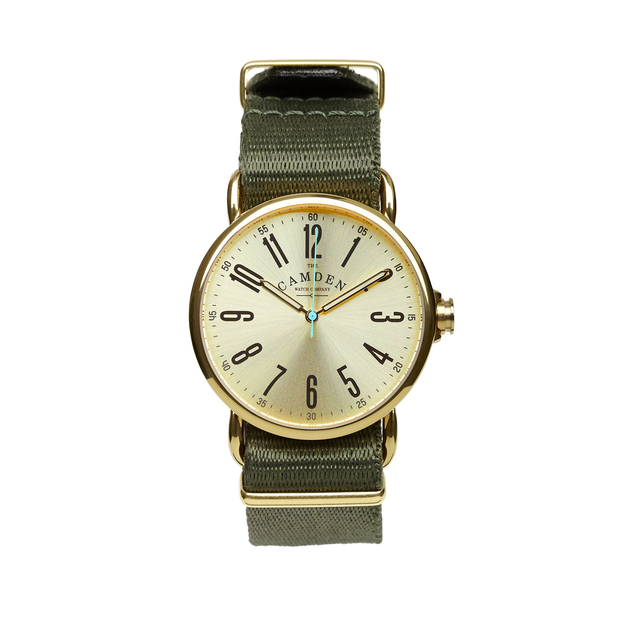 • GOLD CASE WITH GOLD DIAL AND GREEN NYLON STRAP.