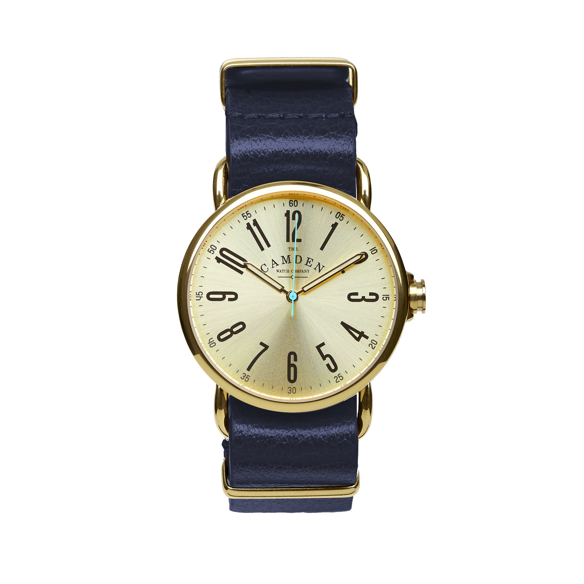 • GOLD CASE WITH GOLD DIAL AND NAVY LEATHER STRAP.