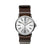 • STEEL CASE WITH SILVER DIAL AND BROWN LEATHER STRAP.
