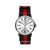 • STEEL CASE WITH SILVER DIAL AND RED AND BLACK NYLON STRAP.